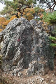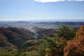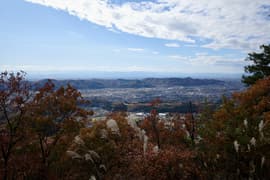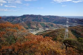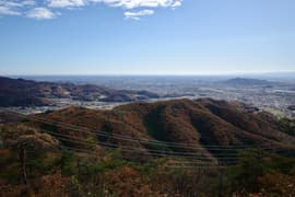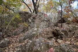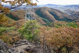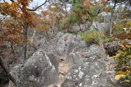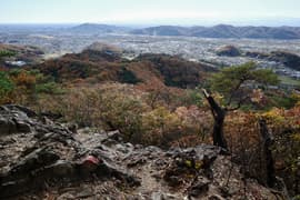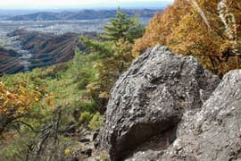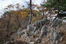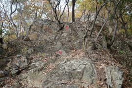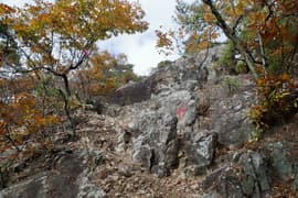 赤ペンキのマーキングを辿って、岩場に取り付く。手がかりと足場が豊富、傾斜も適当で、初心者でも楽しめる。意外と長くて面白い。途中に踊り場的な平地があり、振り返ると巨大な送電鉄塔と紅葉した二十丁山、その向こうに関東平野の眺めが良い。