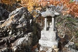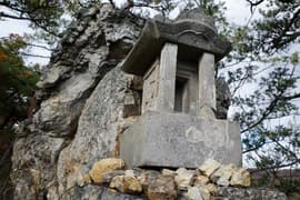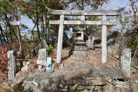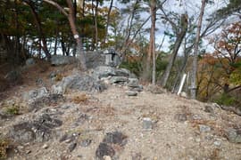 もう一段、岩稜を登って石祠と標高351m三角点の標石のある平地に着き、巻き道と合流する。頂上はもう少し先。赤松と岩を交えた尾根を登ると、出羽三山信仰の祠が次々に現れる。羽黒山神社、粟谷湯殿山神社、月山神社と石祠が続くが、最後の月山は撮り忘れた。