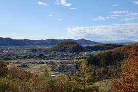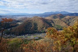 槍見台から、木の間に見える小俣川沿いの集落を見おろしつつグングン急降下する。右側には小俣川を隔てて小俣城山が眺められ、赤城山も遠望できる。
