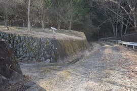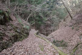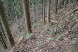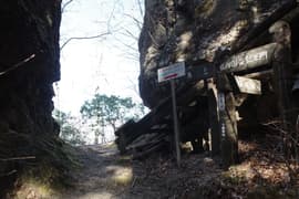 日尾城址のすぐ先で観音山〜牛首峠の登山道に合流する。この地点には「←牛首峠 観音山→」の古くて倒れた道標がある。牛首峠に向かい、杉林の平坦地(これも日尾城の廓だそうだ)を下る。「炭焼き窯跡」という標識のある石垣の前を通り、小尾根を下る。岩稜が現れ、その左を絡んで下ると、岩稜を断ち割ったようなギャップの底の牛首峠に着く。このような両側を高い岩壁に挟まれた峠はあまり見たことがなく、奇観だ。