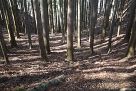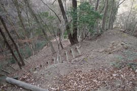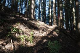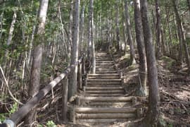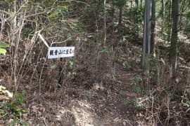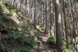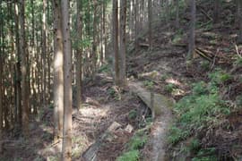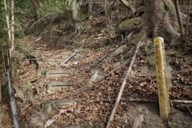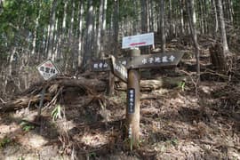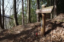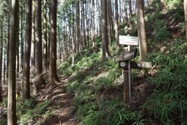 十字路から、いよいよ観音山に向かう。杉林に覆われた山道に入り、階段道を急登する。段差が高くてなかなかきつい。水子地蔵寺への分岐に着くと階段道の急登は終了。左へ山腹をトラバースする道を進むと、程なく牛首峠と観音山の分岐に到着。ここから観音山の頂上を往復する。