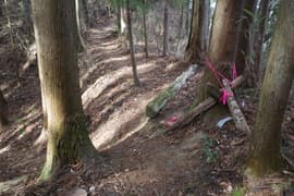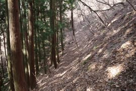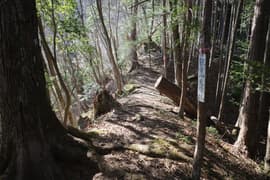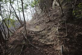 急斜面の道型は微かで、手摺りのトラロープが張られている。小尾根の上に出て急登。急斜面をピンクテープを目印に左斜め上に登り、岩壁の基部を通過して小尾根を乗り越すと、明瞭な道型が現れる。道型を辿ると浅い窪の中に導かれる。