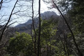 杉林に覆われた尾根道を登ると「観音山見晴坂」の標識が現れる。標識に書いてある通り、この辺りから、左上に木立を透かして、観音山の険しい山容が眺められる。
