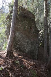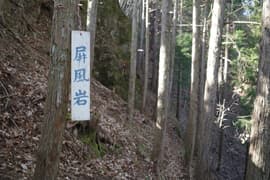 細く急な尾根の上を登っていくと大岩が行く手を遮り、その手前から右斜面のトラバース道に入る。すぐに「屛風岩」という標識があり、どれが屛風岩かははっきりしないが、先程の大岩や大岩の背後に続く尾根上の岩場を屛風岩と称しているようだ。