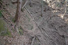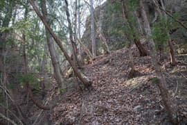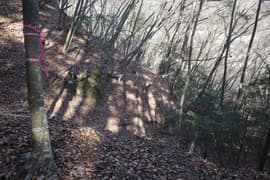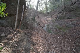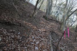 窪の中は柔らかい岩盤の上に落ち葉が深く積もっている。トラロープが張られているが、支点が頼りになるか怪しいので、なるべく荷重を掛けないように登る。上部は傾斜が緩まり、落ち葉に足首まで埋もれつつ登る。途中でピンクテープに導かれて窪から離れ、右斜面を登る。
