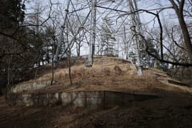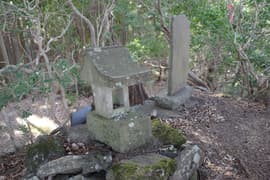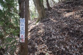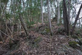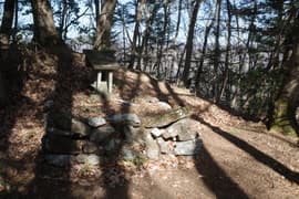 緩やかな起伏のある尾根を登るとすぐに小平地に着き、石祠と「日尾城山八幡」の標識がある。また小平地の裏手の高みにも石祠と「馬上城山八幡」の標識(馬上は北麓の集落で「もうえ」と読む)、小鹿野町教育委員会が建立した「史蹟日尾城跡」の石碑がある。ここが日尾城址で、周囲の起伏が城の遺構のようだが、詳しくないので、何が何だかは判らない。
