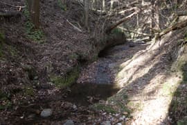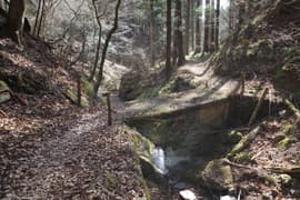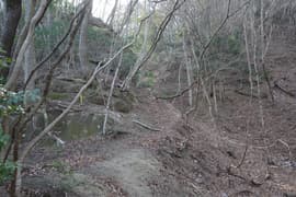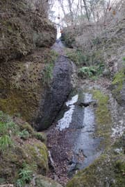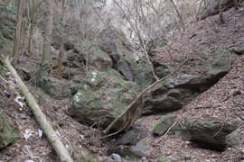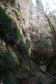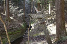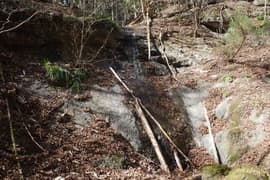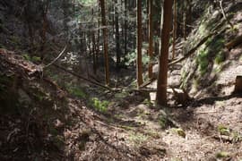 牛首峠から観音院の登り口に向かい、南側の斜面をジグザグに下る。すぐに水のないV字谷の底に降り立ち、深く積もった落ち葉を踏んで下る。やがて右岸から細々と水流のある滑床の沢が合流し、「←岩神の滝」の道標がある。滝があるなら、行って見なければなりますまい。