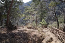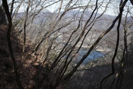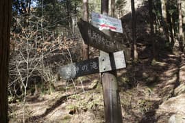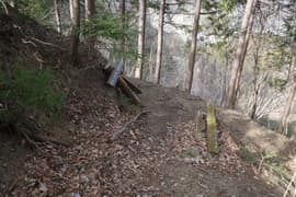 展望を楽しんだのち、分岐まで戻って、牛首峠に向かう。山腹をトラバースすると、左に西奥の院への道を分ける。特に通行止めの標識はなく、(たぶん、岩壁の上にある)西奥の院まで往復できそうだが、今回は割愛。