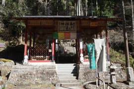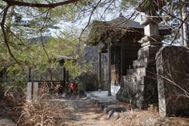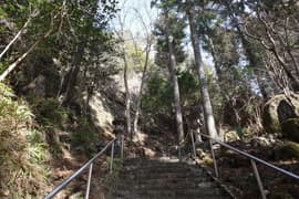 観音院の登り口には山門が建ち、石造の大きな仁王像が左右に立つ。石の仁王像としては日本一の大きさとのこと。山門を潜り、参道の石段を登る。参道の脇には多数の石碑や石仏があり、それらを眺めながら長く急な石段をゆっくり登っていく。石段の終点はT字の分岐となる。左は西奥の院への道だが、落石の恐れがあるため立入禁止となっている。