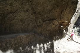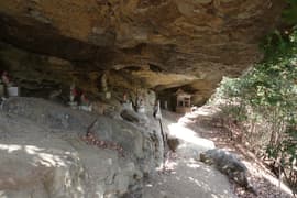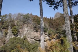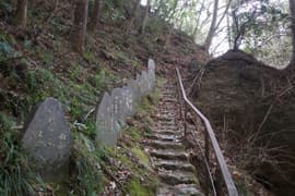 昼食後、東奥の院の先の尾根を進む。右手には観音院上部の大きな岩壁を望み、その右奥には観音山の尖った頂を仰ぐ。尾根の突端は切れ落ちて、石祠がある。さらに切り返して尾根の南斜面をトラバースすると、歩道に沿って長い岩屋がある。ここが馬の蹄跡洞窟で、多くの石仏がある。洞窟を過ぎて登ると、一周して尾根上の十字路に戻る。