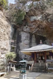 T字分岐から右に進むと、左と正面に高い岩壁を巡らせた小広い境内があり、岩壁を背にして観音院本堂が建つ。本堂の左奥には「聖浄の滝」と呼ばれる滝があり、岩壁の上の落口から細々と水を落としている。これは山水画の世界の風景だなあ。昨年12月に釜ノ沢五峰に登った際に訪れた法性寺(秩父札所32番)も岩山で絶景だった。秩父札所巡りをするのも面白そうだ。滝の左手の岩壁には鷲窟磨崖仏があり、高さ10cm程の小さな浮き彫りの仏が無数に刻まれている。