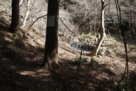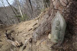 西奥の院の分岐を過ぎると、滑り易いザレや落ち葉に埋もれた急斜面のトラバースがあり、慎重に通過。尾根の鼻を回ったところに石仏がある。文久年間の銘があり、なかなか古い。さらにトラバースして石祠のある小尾根を越え、少し進むと右に山道が分岐する。「中央湖畔ルート」と記された古くて倒れた道標があり、山道の方向には「←湖畔・展望休憩舎」と記されている。
