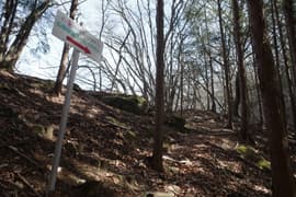 落ち葉に覆われた急斜面を、ピンクテープとトラロープに導かれてジグザグに登る。ようやく平地に登り着き、ホッとする。ここには「城山天狗 危険」の標識がある。この先は幅広く緩い尾根なので、危険箇所はなさそうだが、屛風岩からここまでの間は確かに危ない難路だった。このコースは、登りはともかく、下りはルートファインディングも難しくなるから、使わない方が吉である。