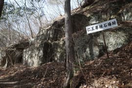 杉と下生えのシダに覆われた斜面を斜めに登って行く。途中、岩が山積した小平地に「仁王像細工場跡」の標識がある。山門の石造の仁王像は、観音山で採掘された凝灰質砂岩(岩殿沢石)を使っているそうで、ここがその現場らしい。