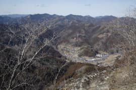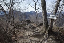 頂上は東西に細長く、三角点標石や山名標識、一段下がった平地に小さなベンチがある。少し先に進むと岩場の上に出て、正面(西)に毘沙門山、両神山、二子山が眺められる。北面はすっぱり切れ落ちた岩壁となり、眼下に日尾集落を俯瞰する。低山とは思えない高度感があり、素晴らしい。