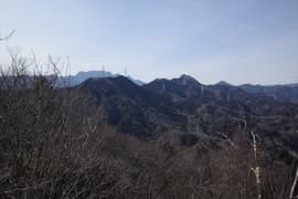 本堂右手の納経所の脇を通って、東奥の院に向かう。細い石段道で尾根上に出ると十字路となり、左は観音山、直進は馬の蹄跡洞窟に至る。右の尾根道を進むと、「矢抜け穴」の案内看板がある。1km遠方に畠山重忠の家臣本田親常が矢を射通したという岩穴があるそうだが、そちらの方向を眺めても、穴の場所は良く判らん。(後日、このとき撮った写真を良く見ると、やはり穴の存在までは判らないが、稜線直下に帯状に広がって、如何にも穴が開いていそうな岩壁が写っていた。)