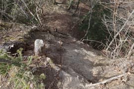 分岐から尾根道となり、次の小ピークは岩壁の左側を巻いて登る。小ピークを越えると鎖場の下りがある。程なく日尾城址の分岐に着く。分岐から牛首峠までは、往路で歩いた区間だ。