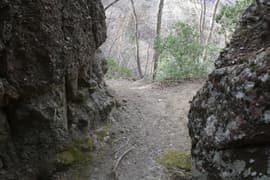 分岐に戻り、本流(岩殿沢)沿いの登山道を下る。古い石垣の護岸が現れ、道はその上に通じている。左岸は大岩壁となり、ゴルジュ状の沢の底を下る。だいぶ昔に遊歩道として整備された様子があるが、大きな倒木が道に横たわっていたりして、全体的に少々荒れ気味。通行に支障はない。周囲の景観は変化に富み、水量も増えた渓谷を下って行くと、今度は「←昇龍の滝」の道標があり、右岸から小沢が出合う。滝があるなら、行って見なければなりますまい(2回目)。