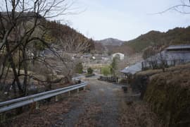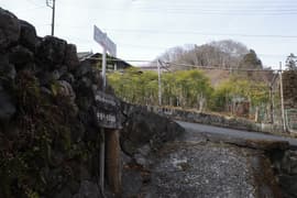 水のない沢(牛首沢)に沿って登山道を下る。ようやく水流が現れて程なく、藤倉集落に下り着いて車道に出る。この地点には「←山野草の里・カタクリ自生地」と「←牛首峠・日尾城址」の道標がある。カラクリ自生地はどこか、気がつかなかった。