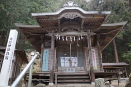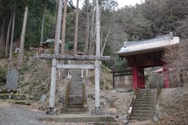 登り着いた境内には古びた社殿が建つ。説明板によると、この社殿は、日本武尊が東征の折、この地を荒らす猪の群れを退治した故事に因み、伊弉諾命(いざなぎのみこと)・伊弉冉命(いざなみのみこと)、後に日本武尊を合祀したもので、現在の社殿は寛政五(1793)年の建立とのこと。また、1月1日、4月第3日曜日、7月20日、11月第3日曜日に祭礼があり、祭典後、氏子・参拝者によって、奥宮のある猪狩山に登り、日本武尊が猪を追い払ったときに雄叫びを上げた故事に倣って「鬨の声」をあげる、という神事が行われるとのこと。現代にも信仰が続いており、興味深い。