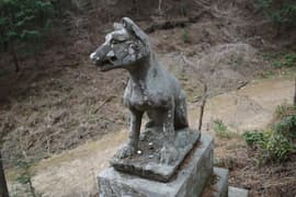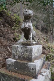 石段の途中の踊り場には「猪狩山」の額束を掲げた新しい木の鳥居が建ち、上段の石段の脇に一対の狛狼が鎮座する。左側は阿形の雌狼、右側は吽形で立派な一物が模られた雄狼だ。台座には「昭和八年四月吉日」の銘がある。