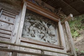 社殿の右側面には「韓信股くぐり」を題材とする立派な彫刻がある。ところで、韓信股くぐりって何だっけ🤔。詳しい説明板があり、読んでみると面白い。長いのでAIで要約すると『韓信は若き日、長剣を背負いながらも無頼の徒に「俺の股をくぐれ」と挑発された。周囲が見守る中、韓信は抵抗することなく股をくぐり、嘲笑を浴びた。しかし、この屈辱は将来の天下を見据えた韓信の冷静な判断であり、「三十六計逃ぐるにしかず」を体現した行為であった』ということだそうだ。なお、彫刻は明治20年、秩父郡山田村の彫工、大島角太郎の作とのことである。