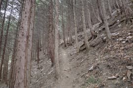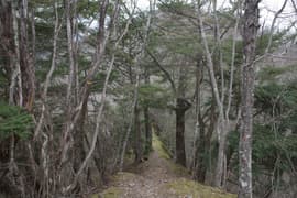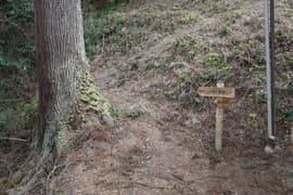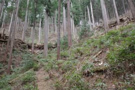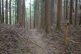 ゆっくり休んだのち、下山にかかる。タツミチまで戻り、三峰口駅へのコースに入る。杉植林帯のなだらかな尾根で、途中の小ピークは登らずに巻いているので楽だ。枝尾根の迷い易い分岐には道標が設置され、間違った尾根に入り込まないよう、トラロープで塞がれている。