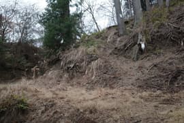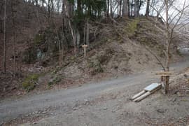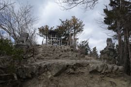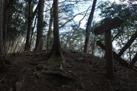 滑ったら止まれない急斜面が続き、特に左側は切れ落ちて恐ろしい。神事の際は皆んなここを登るのだろうか。お年寄りは無理なんじゃないかなあ。下を見るとクラクラするので、足元だけを見て必死に登る。昨年末に登った毘沙門山の急坂にはビビったが、この急坂の危険度はそれ以上だ。