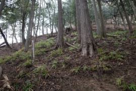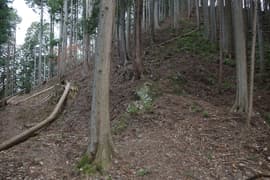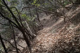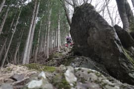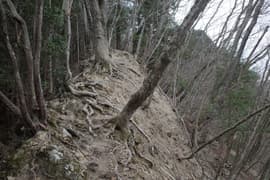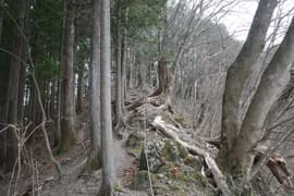 林道御岳山線のカーブを通過すると、さらに急傾斜に。落ち葉に埋もれた微かな道型を辿り、小さくジグザグを切って急登する。ところどころに固定ロープが張り流されているが、古いので体重を掛けて頼るのは禁物である。