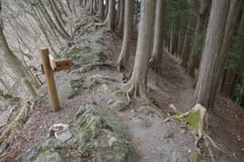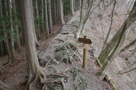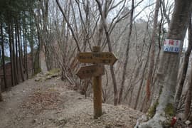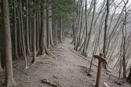 程なく、三峰口駅からの登山道と合流する「タツミチ」と呼ばれる地点に着く。ピークかと思ったら、単なる尾根道の途中だった。帰りは三峰口駅へ下る予定。ここから御岳山の頂上を往復する。