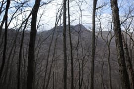 834m標高点の辺りから、木立を透かして行く手に御岳山の頂が見えてくる。林道御岳山線に出て横断。案内図によると、御岳山線は秩父市大滝地区と荒川贄川(にえがわ)地区を結び、林業の他、御岳山登山のアクセス道路としての利用も想定されているらしい。確かにここまで車で来れば御岳山に楽に登頂できる(が、歩き応えがなくなってつまらなくなるから、私はしないけどな)。