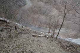 林道からザレた尾根を登る。右側は林道の法面で切れ落ちており、高度差があって結構危ない。