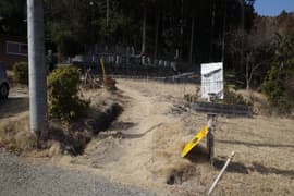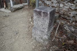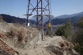 右斜面をジグザグに下ると、尾根上に建つレトロな送電鉄塔に着く。この辺も眺めが良い。さらに下って、墓地の脇を通る。「即道の墓 奇形な墓石」と書かれて倒れかけた標識があり、傍に2基の卵塔と不規則に穴が開いた石がある。この石にはなにやら文字が刻まれており、これが奇形な墓石か。なお、後日調べると、即道とは元禄時代に秩父に住んでいた僧侶で、伝説的な奇人らしい。