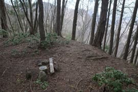 ようやく傾斜が緩み、猪狩山の頂上に登り着いてホッとする。ここは下りたくない。先行のソロハイカーさんが休憩中で、急でしたねー、と挨拶を交わす。頂上には石祠が2基あり、紙垂が張られてカップ酒がお供えされている。樹林に囲まれて展望に乏しいが、木の間を透かし見ると古池の集落が俯瞰でき、ほぼ真下に見える。いやー、とんでもなく急な所を登って来たものだ。