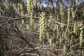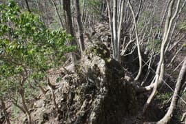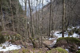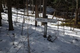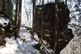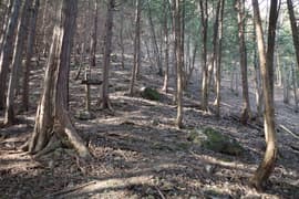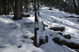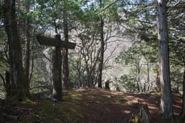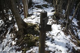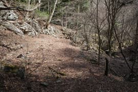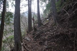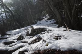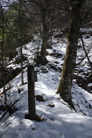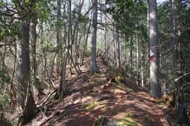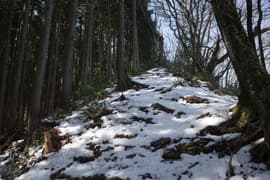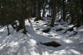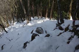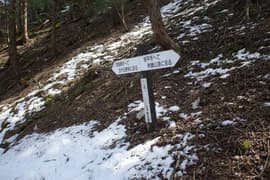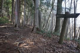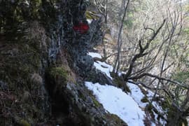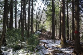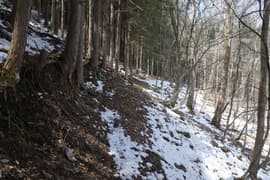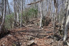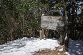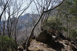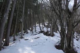 小ピークから一旦少し下り、小ギャップの底から露岩に木の根が絡む急坂を登る。急坂を登り切った地点に「落石・足元注意!」という文字が掠れた看板がある。露岩の多い尾根をアップダウン。一部は小さな岩稜となっている。再び急坂の登りとなり、また「落石・足元注意!」の看板を通過。大岩が現れ、右から巻く。この辺りから残雪が現れる。先行者のトレースは全くない。小さな岩場を越え、杉林に囲まれた尾根道を登ると「奥秩父自然遊歩道№26-2」の道標のある地点に着き、ここで右から本谷コース(廃道)を合わせる。このすぐ先が1238m標高点のピークで、杉やアセビに囲まれた小広い平地となっている。