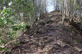 これから登る小幡尾根の急斜面を高々と見上げて気合を一つ入れたのち、尾根上の登山道を歩き出す。最初はなだらかな尾根道だが、すぐに杉林の急斜面に取り付いて、ジグザグを切って登る。道幅が狭く微かな区間もあり、とにかく急斜面なので滑落注意。