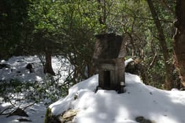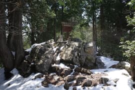 残雪の量を甘く見たため、最後の方はヒヤヒヤしたが、何とか熊倉山の頂上に登り着く。頂上は細長く平らで、樹林に囲まれて展望は全くなく、地味な雰囲気。地味過ぎて、却って記憶に残っている。熊倉山登山道案内図の看板があり、その前は陽当たりが良くて雪が消え、地面が見えている。奥の小さな岩場の上に三角点標石と、錆びた鉄板に手書きされた「熊倉山」の文字が不気味で有名な山名標識がある。すぐ先の石祠に参ったのち、案内図の看板の前の日向に腰を下ろして昼食休憩。ガソリンコンロでお湯を沸かし、カップ麺の天麩羅蕎麦を作って食べる。