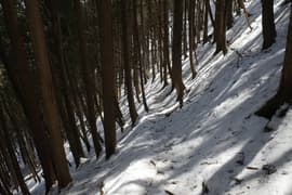 分岐から日野コースに入り、杉林の急斜面をトラバースして下る。この斜面も雪が一面に残るが、サクサクと下れて楽しい。大きく蛇行して下る。途中でこの日初めてのハイカーさんとすれ違い、挨拶を交わす。この先は当然トレースがあり、ちょっとガッカリする😅