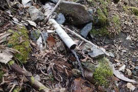 笹平から緩やかな谷間の中を下る。右岸の斜面をトラバースすると「水場」の道標あり。谷間に向かって僅かに下ったところに水場があり、塩ビパイプから滾々と水が湧き出している。