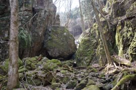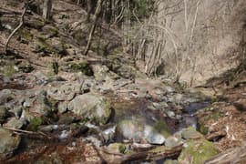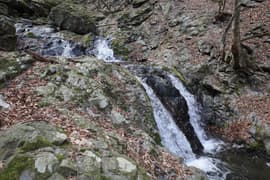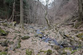 水場を過ぎると登山道は谷から離れて山腹をトラバースし、大きくジグザグを切って斜面を下る。途中には小さな岩場の下りもある。振り返って見上げると、蟬笹山から日野に向かって落ちる宗屋敷尾根がギザギザとピークを連ねて、奥山の雰囲気がある。やがて小さな谷間の底に下り着く。すぐ上流には巨大な岩壁を割るようにして水量の少ない滝がかかる。岩を覆う苔の緑が美しい。