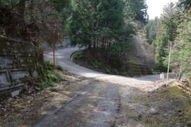 ここからは沢の中を下る。数回、飛び石伝いに水流を渡る。渓流には小滝もあり、なかなか楽しいが、沢歩きはそう長くなく、程なく左岸の林道三又線終点に着く。