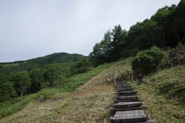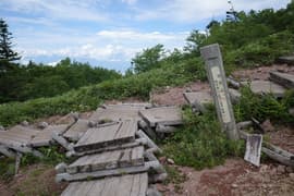 一息付いたのち、急斜面をジグザグに登って頂上稜線の上に出、菅平・根子岳からの登山道に合流する。さらに稜線をちょっと登ると四阿山の頂上に到着する。