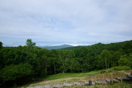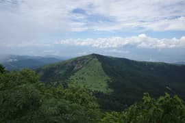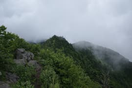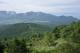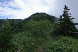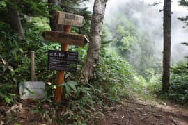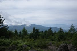 頂上からの展望は、遠景は雲に遮られるが、お隣の根子岳はくっきり見える。北東には細くギザギザした上信国境稜線が延びる。こちらの稜線は未踏なので、ちょっと興味を惹かれる。また、南面を見下ろすと、嬬恋清水付近の笹原と水場への脇道が見えることに気が付く。