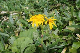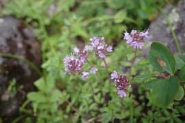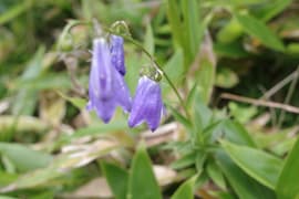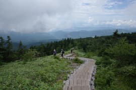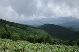 花童子の宮跡の東屋で一休みした後、さらに登る。高度を稼いで振り返ると、嬬恋高原の畑地の向こうに浅間連峰の湯ノ丸山や烏帽子岳を望む。谷から吹き上がって来る風が涼しくて気持ち良い。登山道の脇にはマルバダケブキやイブキジャコウソウなどの夏山の花が点々と咲いている。