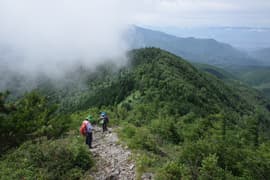左から的岩経由の登山道が合流する古永井分岐(2040m標高点)に登り着き、ここの東屋で一休みする。登山道はここから僅かに下り、樹林帯を抜けて低木帯と笹原に出、2144m標高点に向かってザレと岩混じりの尾根道を急登する。眺めが開け、振り返ると浅間連峰が白雲の間に見え隠れする。高度感があり、爽快な眺めだ。