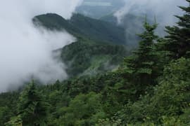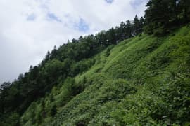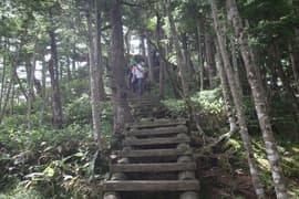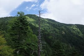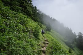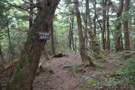 深い針葉樹林に覆われた尾根道を登る。ところどころから四阿山の頂上稜線が高く仰がれる。やがて、嬬恋清水の分岐に到着。体力を温存するというHさんとIさんはここに残って、元気なHgさんと私で、100m程笹原を下った所にある嬬恋清水を往復する。この水場は清水がコンコンと湧き出ていて、飲むと冷たくて美味しい。HさんとIさんも、Hgさんが汲んで戻った冷たい清水を味わう。