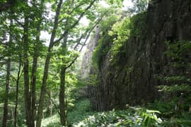 頂上で展望を楽しんだのち、往路を戻る。下りは楽で速い。古永井分岐の東屋で一休みしたのち、的岩経由の登山道を下る。途中、左手に花童子の宮跡付近の笹原を眺める。やがてコメツガ原生林に入り、ゆるゆる下ると的岩に着く。あとは樹林中の笹原の刈り払い道を緩く下って、登山口の駐車場に帰着した。