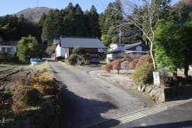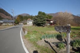 30分程歩いて蟇沼の集落に入り、「←安戸山」の道標のある十字路を左折。蟇沼公民館の前を通る。この辺りから、左手の山並みの間、谷間の奥に安戸山の鈍角三角形の山頂部が眺められる。公民館の先に立派な御影石製の「←安戸山」の道標があり、左折して路地を上がる。