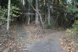左岸の山腹をトラバースする。右側の谷は小さいが、意外と深く険しい。薄暗い杉林の中に入って山麓に近づくと、他のいくつかの林道との合流点がある。下りで迷う個所はないが、登りの逆コースで迷いそうな分岐には、安戸山への登山道を示す古い案内プレートが設置されている。