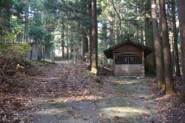 集落を離れて杉植林の中の細い車道となり、石段道が分岐する。これはどっち?取り敢えず石段を上ると、すぐに車道に合流して、小さな神社が現れる。後日調べると、この神社はWikipediaの蟇沼の記事に温泉神社として記載されている。